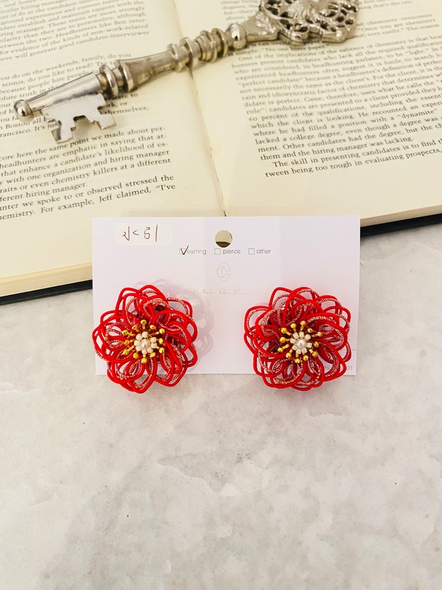 結び型のイヤリングパーツに赤いヴンテージビーズのお花を4つに雫型コットンパールで華やかに仕上げました。イヤリングの金具は真鍮を、使用しております。 送料、配送方法 レターパック 全国一律520円 宅急便コンパクト 全国一律660円 5000円以上のご購入の方は、送料無料です。 サイズ 全体 約6cm