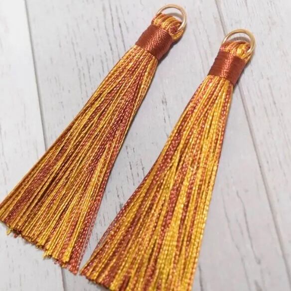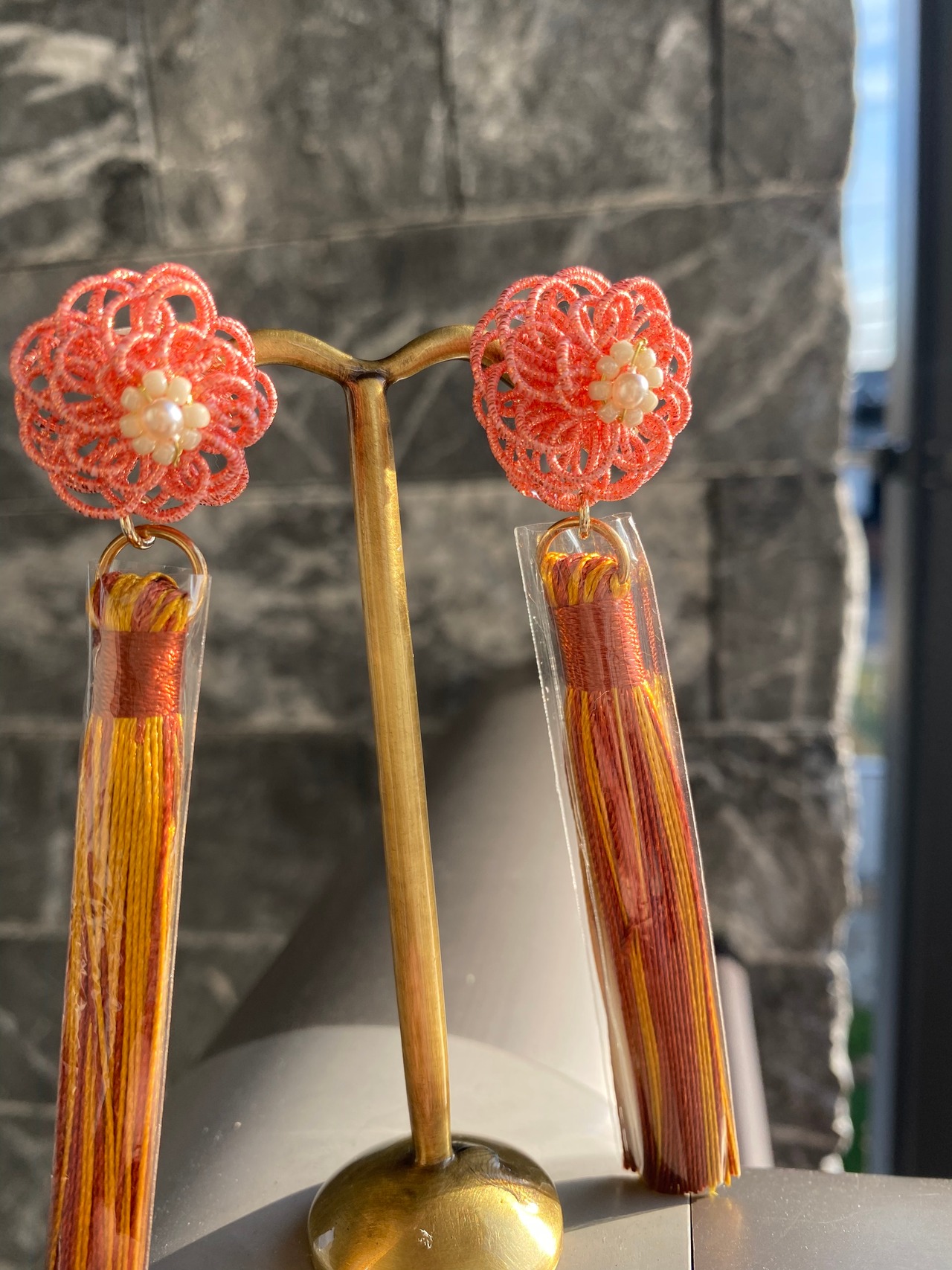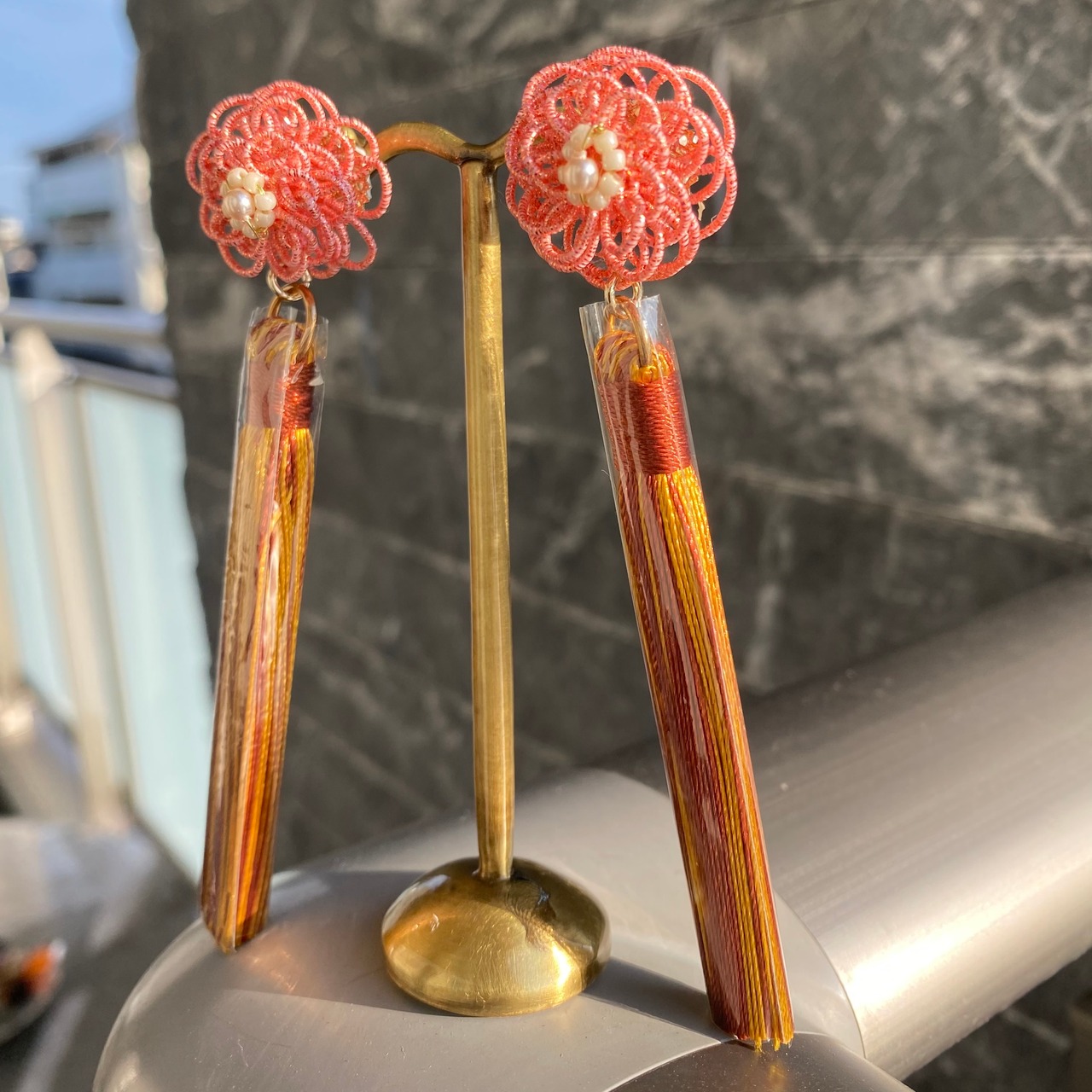 一本の水引から出来ているお花に芯はビーズで装飾して可愛らしく、高級タッセル 茶✖️橙を組み合わせました。成人式や卒業、入学など和装の装いや普段着にも合わせやすいデザインです。
