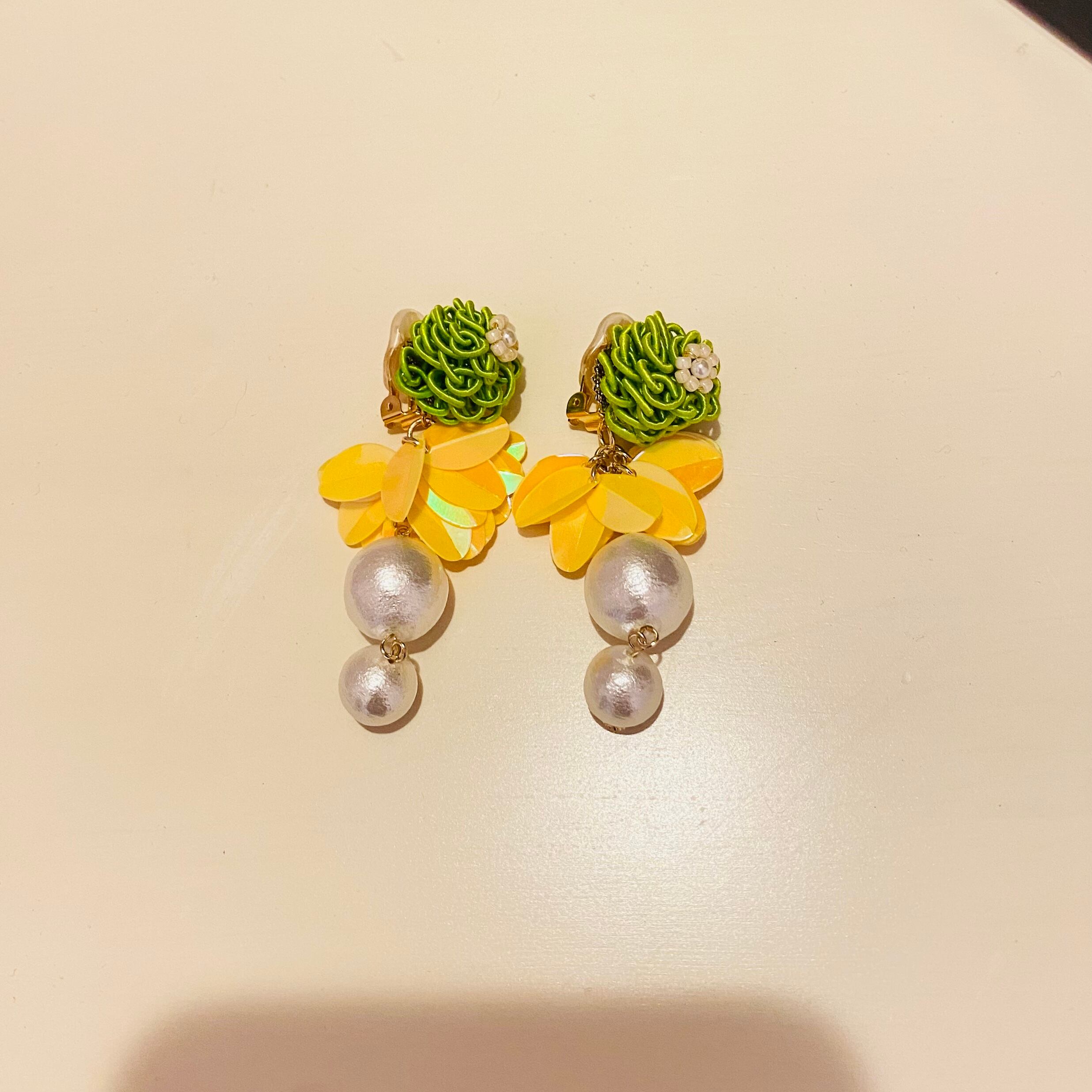 水引のお花にスパンコールとコットンパールの組み合わせです。