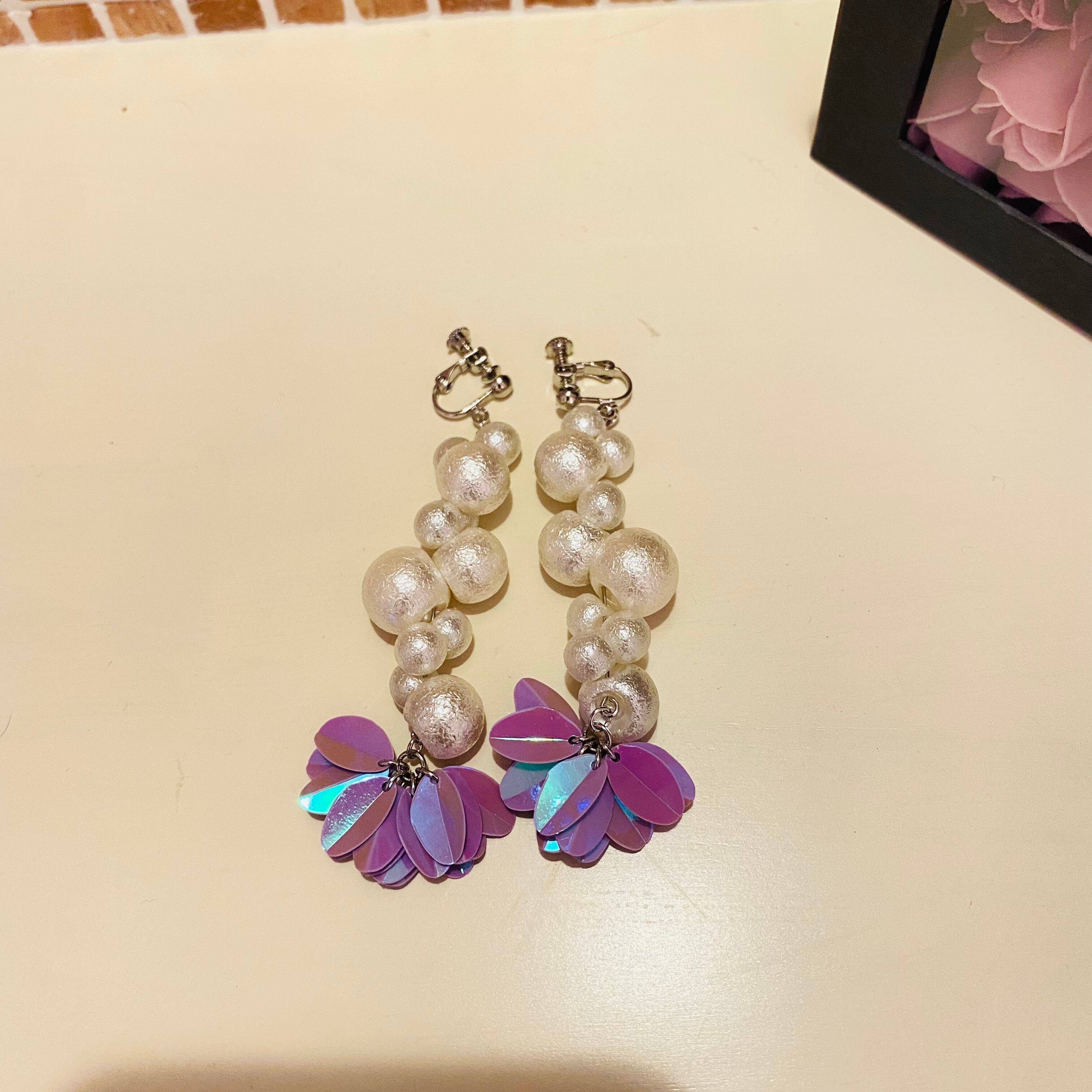 鈴丸コットンパール調イヤリング 楕円オーロラパープル