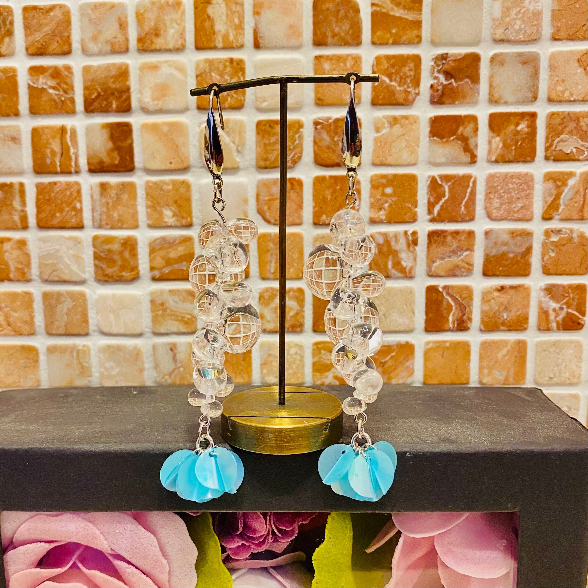鈴丸アクリルビーズ2種類とチェコビーズ2種類のサイズを不揃いにころんと可愛く繋げて、スパンコールをあしらって、優しく揺れてキラキラで可愛く仕上げました。