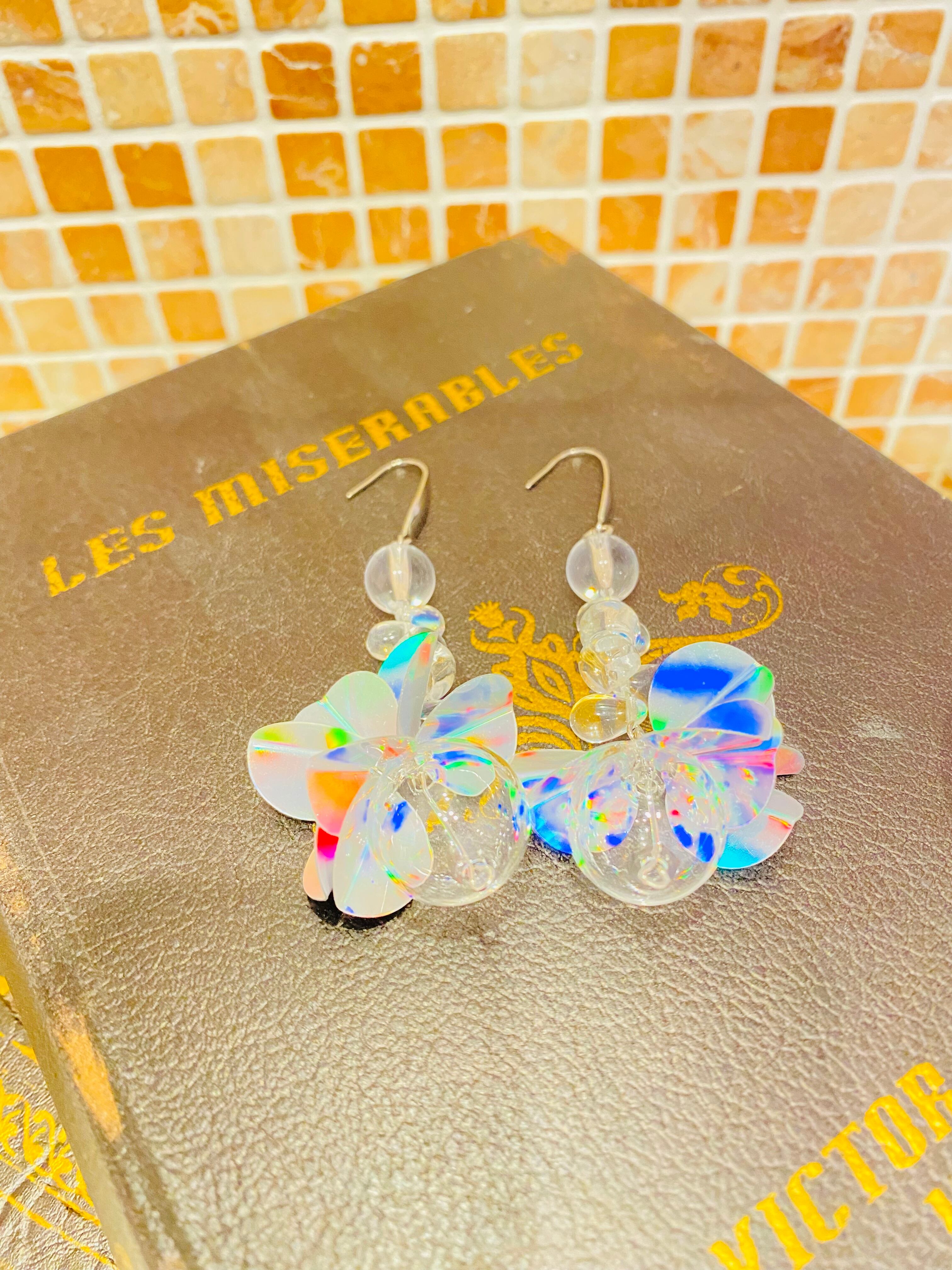 アクリルビーズと雫型ビーズとガラスビーズとスパンコールのシンプルなピアスです。軽く、スパンコールがキラキラして可愛いです。