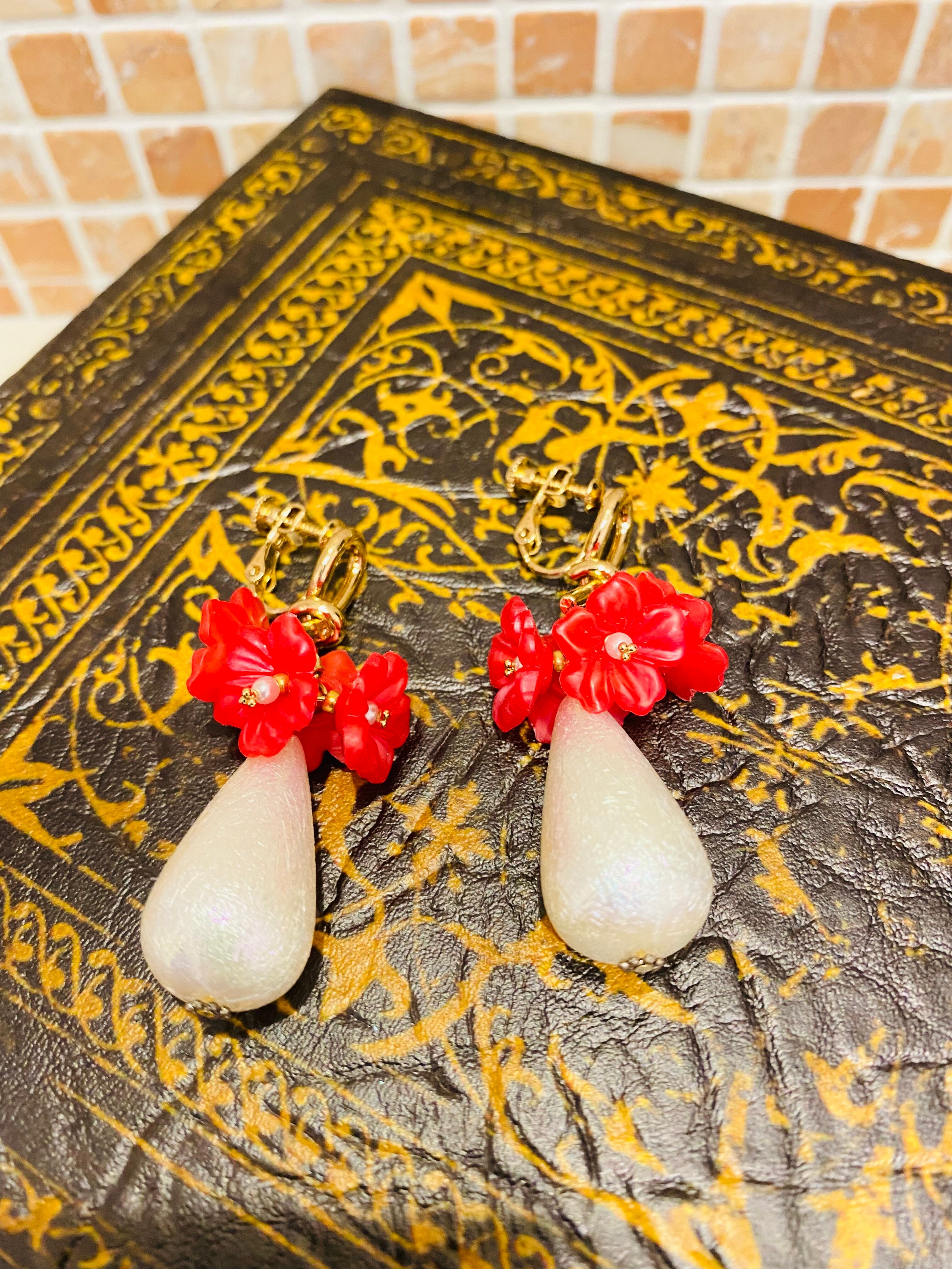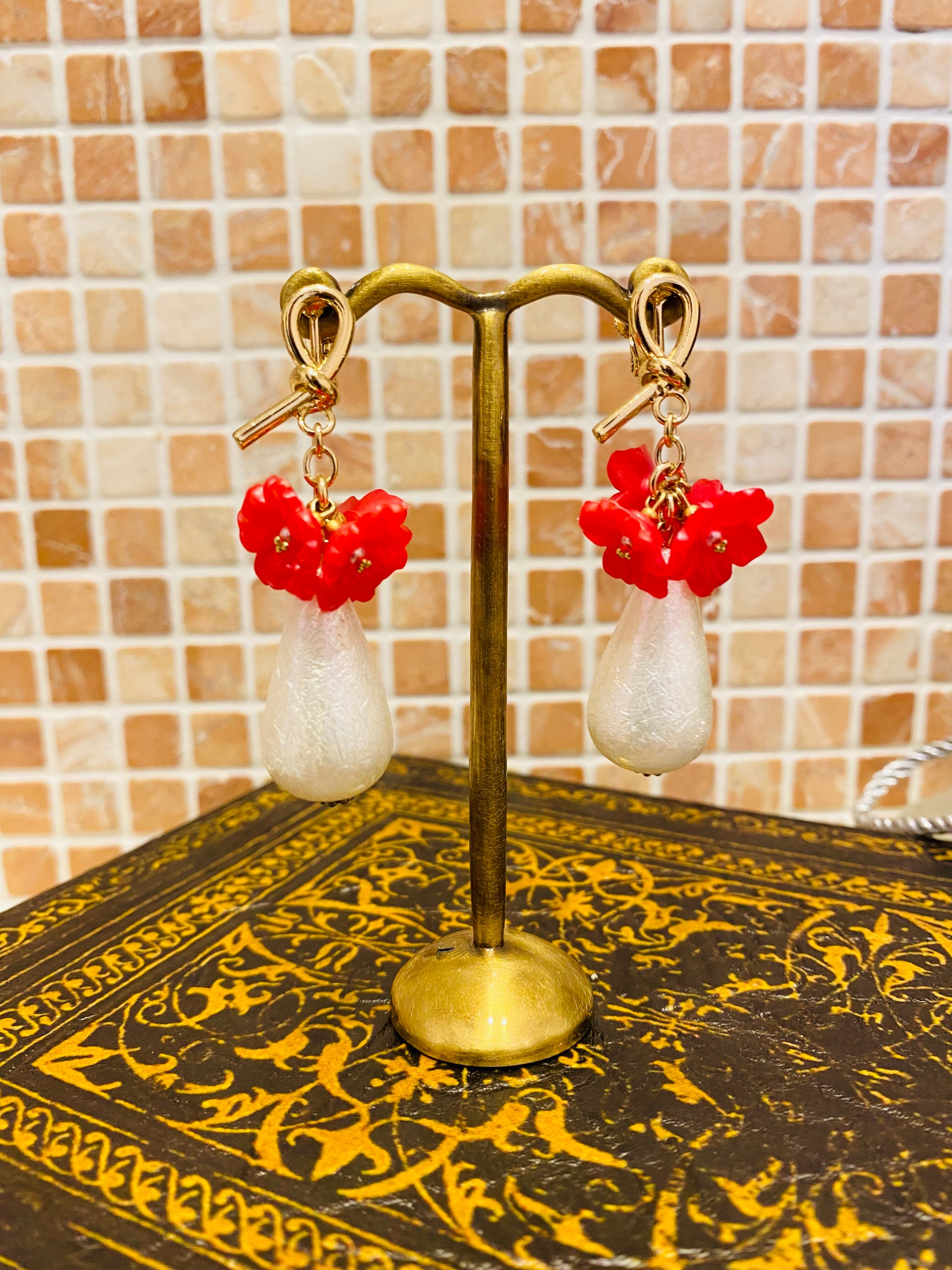 結び型のイヤリングパーツに赤いヴンテージビーズのお花を4つに雫型コットンパールで華やかに仕上げました。イヤリングの金具は真鍮を、使用しております。