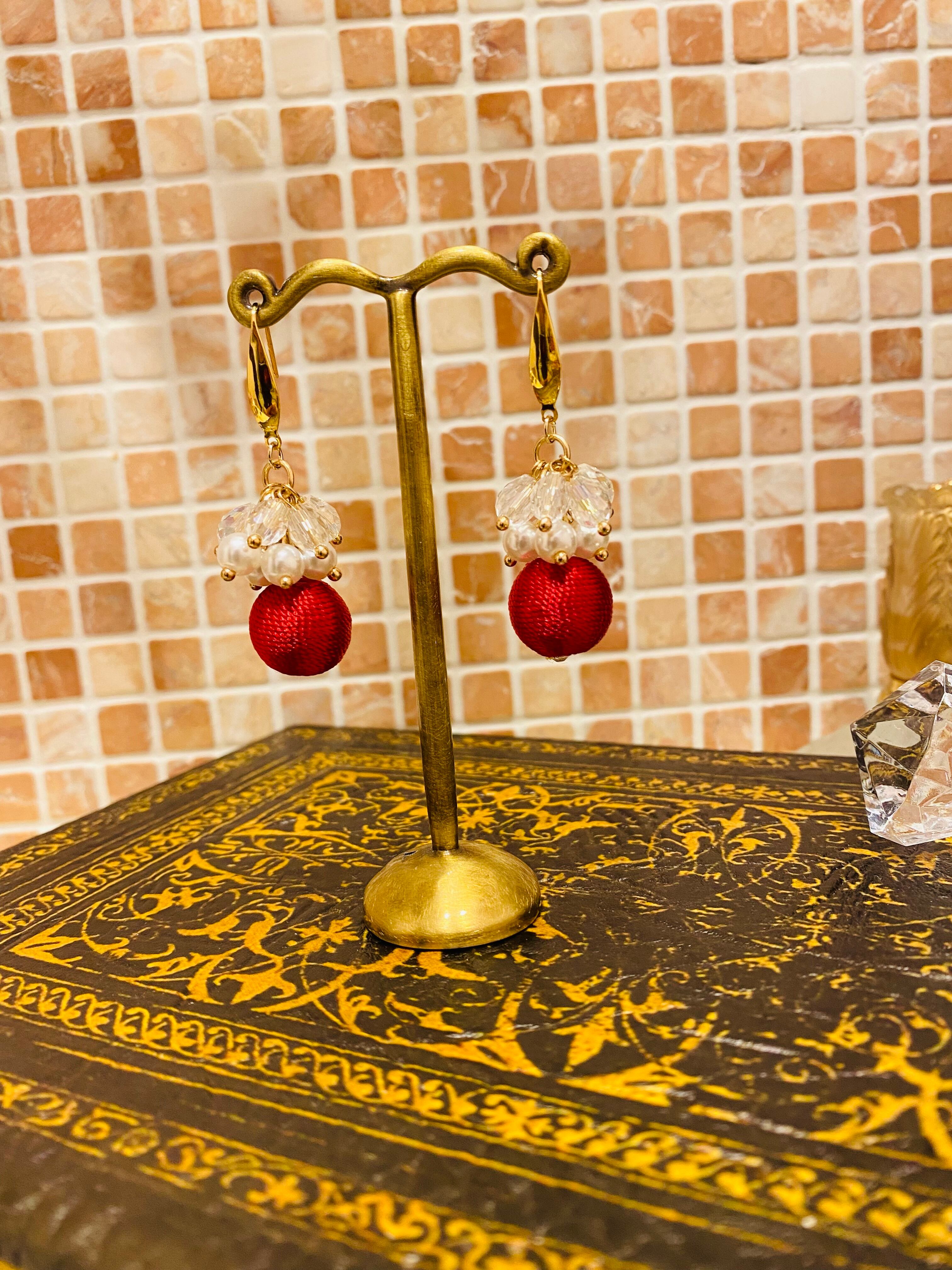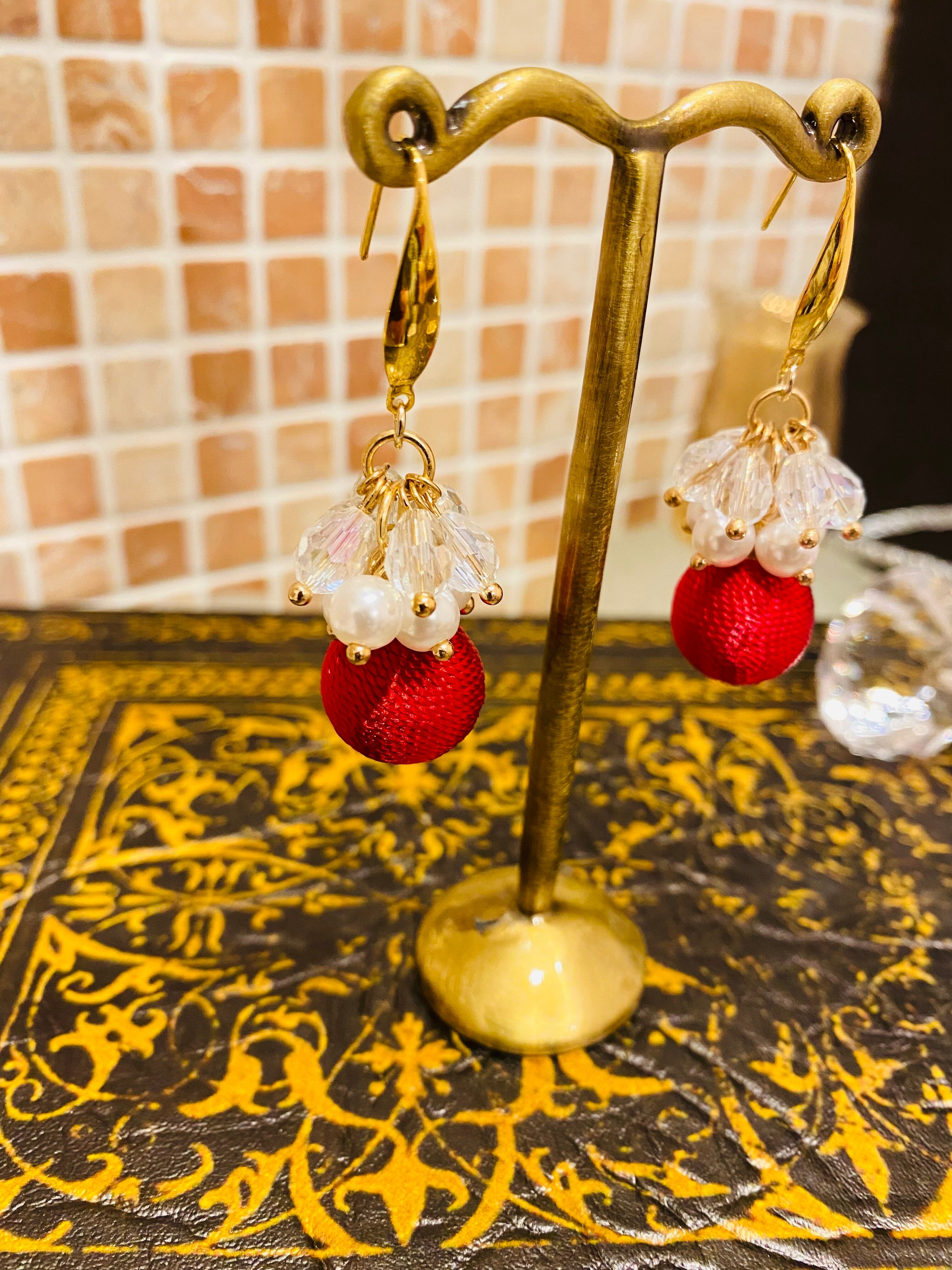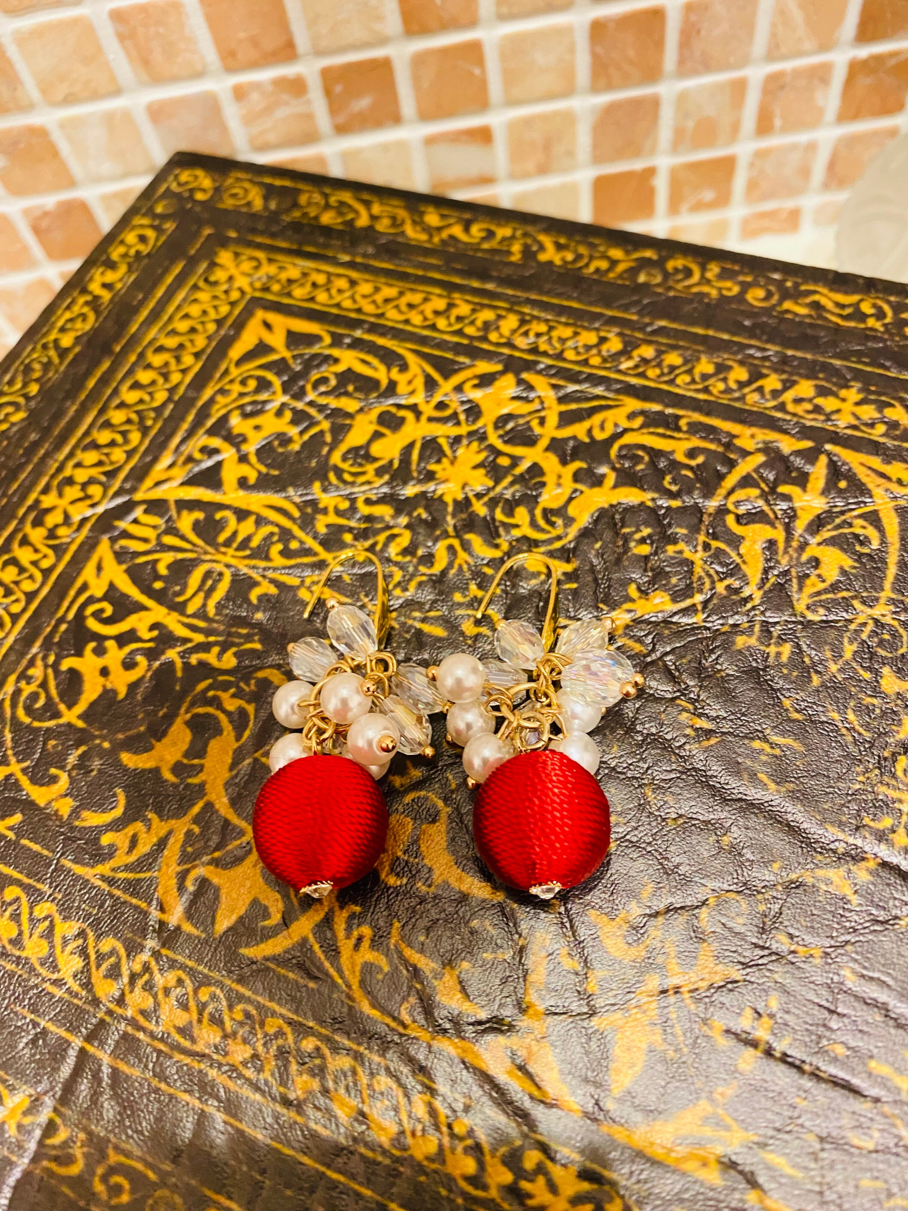 アクリルビーズとパールを重ねて色の鮮やかな糸巻きビーズがアクセントになるピアスです。