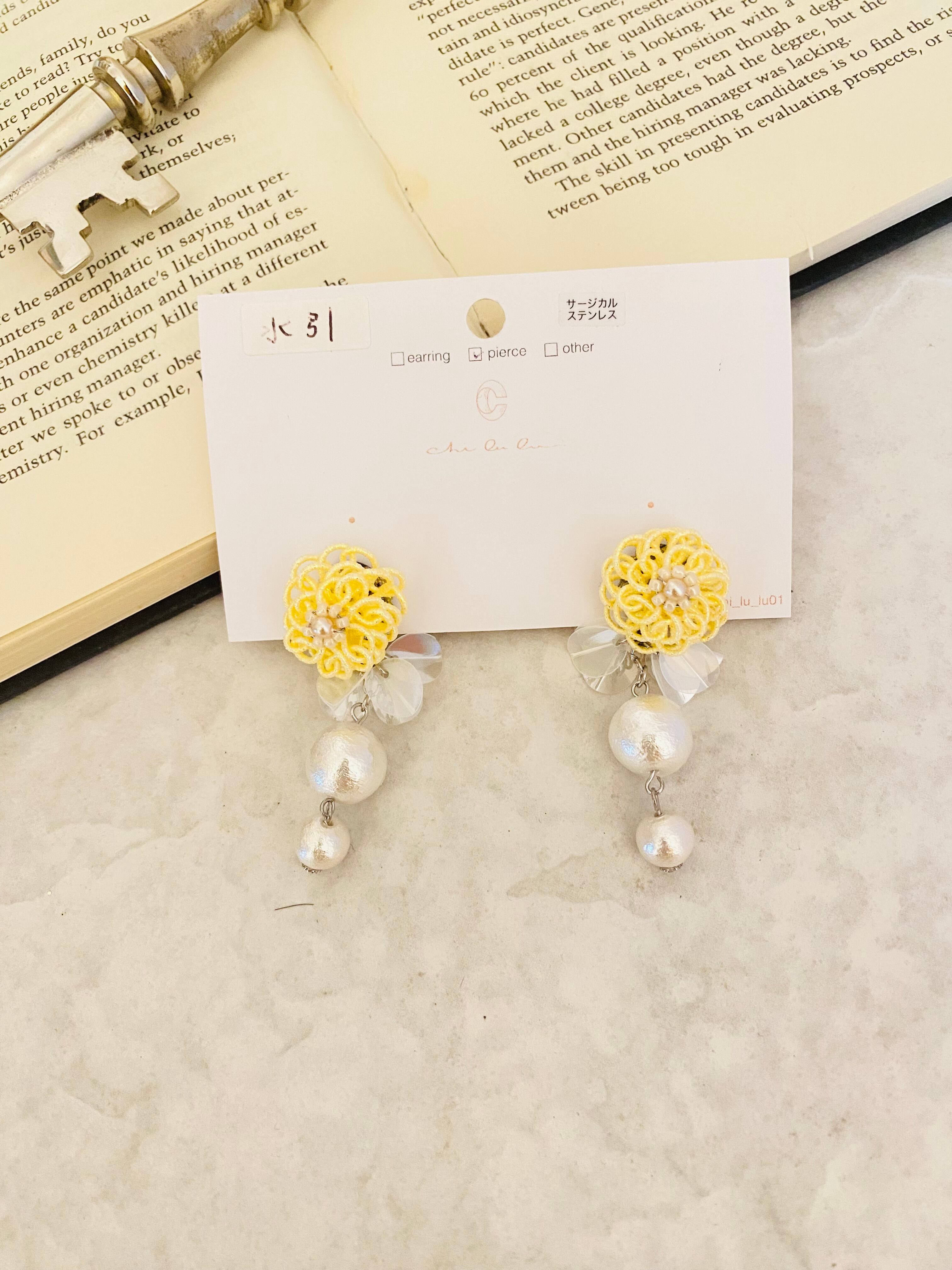 一本の水引から作るお花とスパンコールとコットンパールをバランスよいタッセルで可愛く、スタイリッシュに仕上げました。とても軽い付け心地です。