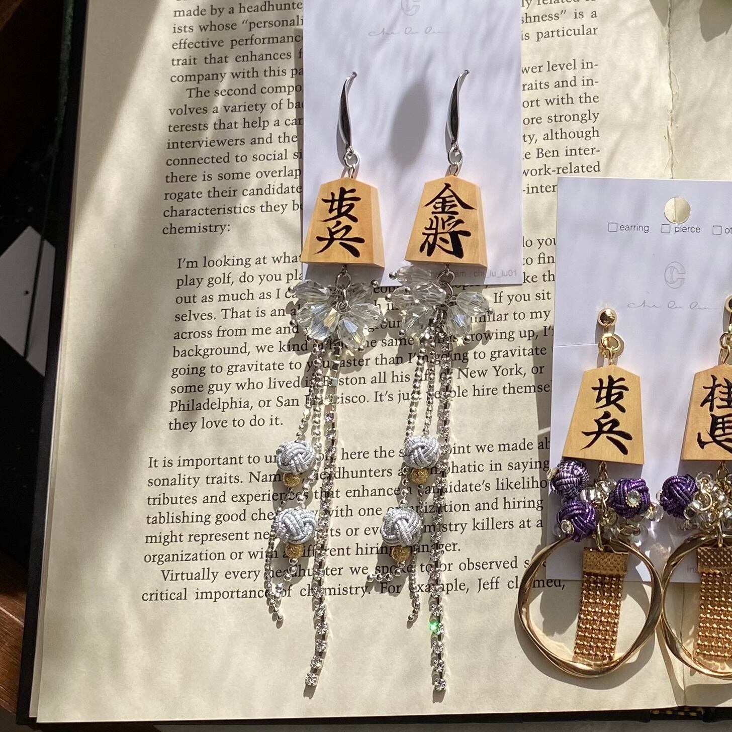 将棋の駒とキラキラアクリルビーズとチェーンのピアスシルバー